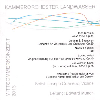 Mittsommerkonzert des Kammerorchesters Landwasser, März 2017 J. Sibelius: Valse triste J. Svendsen: Romanze für Violine und Orchester, Op.26 E. Grieg: Morgenstimmung, a.d. Peer-Gynt-Suite No.1 N.W. Gade: Sommertag auf dem Lande, Op.55 J. Sibelius: Andante festivo Kammerorchester Landwasser Solist: Joseph Querlieux, Violine Leitung: Edward Münch 06/2016 Preis: EUR 5,- zzgl. Versandkosten |